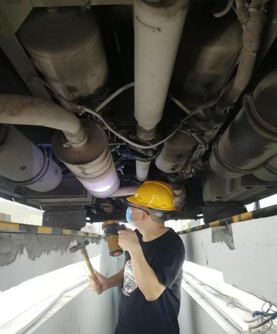 一把榔頭只為堅守源頭安全。在車站車輛例檢處,例檢員劉海正在烈日下作業(yè),滾燙的水泥地面、發(fā)熱的客車底盤和客車尾氣讓車輛例檢臺溫度更高。劉海不停地在車輛底部鉆進鉆出,從燈光、轉向、制動、底盤,到車胎、螺絲、安全帶、消防錘等,認真檢查著每一個車輛部件??蛙嚨撞康母邷刈屗氯ヒ淮伪闳頋裢敢淮?,臉上的汗也順著頭發(fā)往下滴落。說起自己的工作,劉海認為雖然工作環(huán)境惡劣一些,但是與售票員、檢票員并沒有什么不一樣,只是分工不同,做好車輛例檢工作,保障客車運行安全,是我們的責任,目的都是為旅客出行服務。